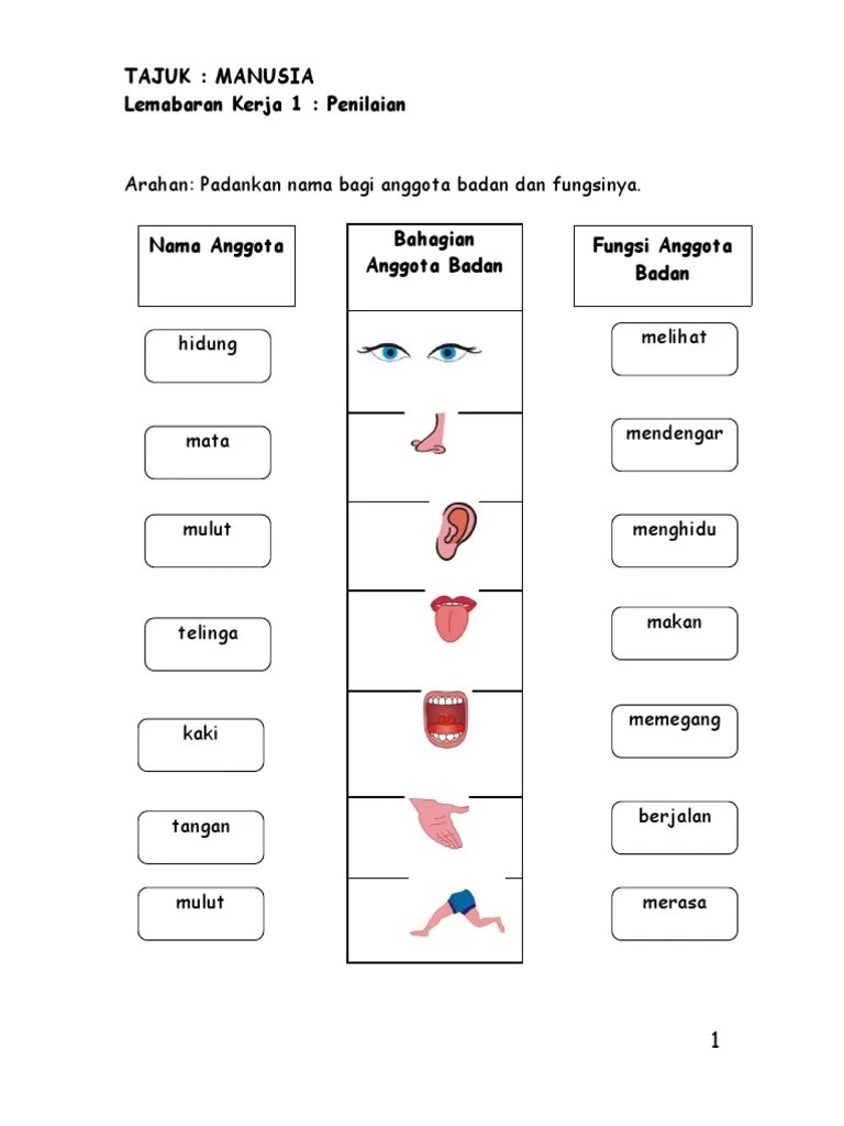 Tubuh Manusia Lembaran Kerja Anggota Badan - Penilaian Sumatif Pk Tahun 1